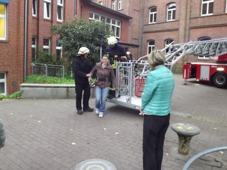 Am 26.09.14 fand an unserer Schule die turnusmäßige Feueralarmübung statt. Die Schülerinnen und Schüler sowie die Lehrkräfte mussten beweisen, dass sie alles, was in den Belehrungen vermittelt wurde, beherrscht wird. Zur Zufriedenheit der der Fachleute klappte alles. Unsere Sekretärin Frau Rieger, die sich zurzeit der Alamierung in der oberen Etage aufhielt, wurde erfolgreich mit der Drehleiter der Freiwilligen Feuerwehr Seehausen gerettet.