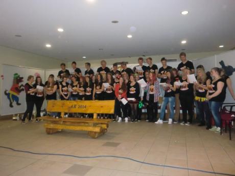 Am heutigen Mittwoch gestalteten die Schülerinnen und Schüler der 10. Klassen ihren letzten Schultag. Voran ging die schon traditionelle Mottowoche, zu den Themen: Alles auf Anfang, Bauerntrampel – Stadtkind, Damals wie heute – die Besten, Stay cool – Stay ugly und der letzte Schultag stand unter dem Motto: Endlich hat der Zirkus ein Ende. Zur Freude der anderen Klassen war die Schule geschmackvoll geschmückt. Leider hatten unsere Zehntklässler etwas Pech mit dem Wetter. Also wurde das Abschlussprogramm in das Foyer der Wischelandhalle verlegt. Lehrer und Schüler wurden auf die Probe gestellt. Frau Reikowski nahm das Abschiedsgeschenk in Form einer Bank für die Schule entgegen. Mit einer Gesangseinlage verabschiedeten sich die 10. und wir wünschen für die bevorstehenden Prüfungen alles Gute.