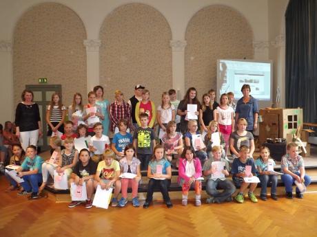 Arbeiten von Schülerinnen und Schülern der 5. bis 10. Klassen werden bis Anfang September gezeigt. Künstler aus der 5. Klasse der Gemeinschaftsschule und der 9. Klassen stellten stellvertretend den Anwesenden ihre Werke vor.