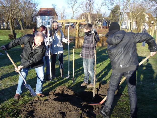 Im grünen Klassenzimmer gab es kürzlich wieder eine schöne Aktion. Erbauer und Mitglieder der AG pflanzten drei Apfel- und zwei Pflaumenbäume. Tatkräftige Hilfe erhielten die Schüler von Dr. Günther und Herrn Behrendt, der als Gärtner auf eine fachgerechte Pflanzung achtete. Auch unser Verbandsgemeindebürgermeister, Herr Reck, schaute kurz vorbei.