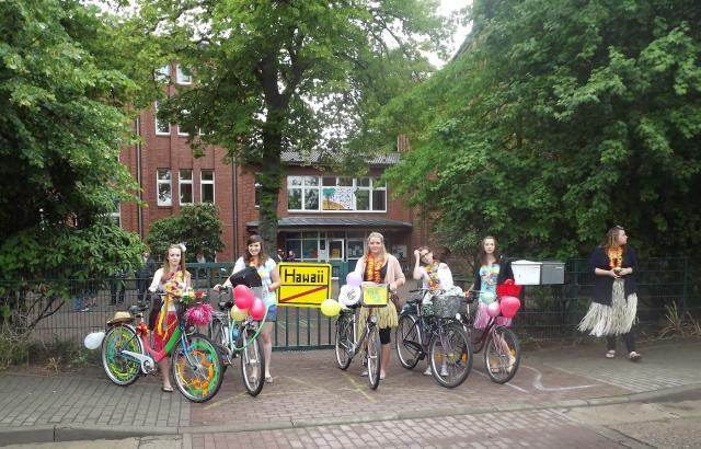 Unter diesem Motto verabschieden sich unsere Abschlussklassen von unserer Schule (letzter Schultag - nach Hawaii erst nach den mündlichen Prüfungen!!). Geschmackvoll und mit einem riesigen Aufwand schmückten sie den Eingangsbereich und die Flure. Jetzt warten wir auf das Abschlussprogramm.