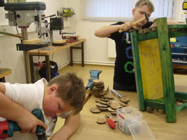 Das grüne Klassenzimmer unserer Schule wird ein neues Element erhalten. Aus vielen interessanten Entwürfen wird nun eine ungewöhnliche Idee von Jason Voigt aus der Klasse 7b umgesetzt. Derzeit bauen die Schüler im Rahmen des Schulprogramms mit Eifer und viel Spaß an zwei Vogelhäusern mit "Warteschleife" für die hungrigen Vögel. Wir bedanken uns bei Lutz Hübner, der die Vorarbeiten verrichtete und uns bei der Arbeit unterstützt.