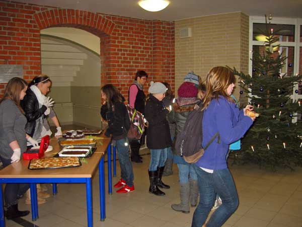 Am 12.12.2011 führten die Schülerinnen und Schüler der Klasse 9h einen leckeren Frühstücksverkauf durch. Mit viel Fleiß und Begeisterung wurde eine reichhaltige Auswahl von Brötchen, Bockwurst und Kuchen hergerichtet und anschließend zum Verkauf angeboten. Die Schüler und die Lehrer freuten sich über diese Abwechslung. Ein besonderer Dank gilt den Eltern, die uns tatkräftig unterstützt haben.