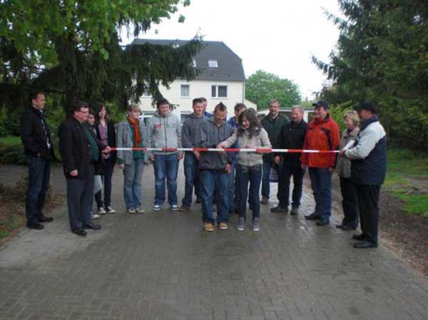 Endlich ist es geschafft. Heute wurde die neue Straße an unserer Schule feierlich übergeben und das symbolische Band durchschnitten. Zur Übergabe erschienen Vertreter der Stadt, unter ihnen der Verbandsbürgermeister Herr Schwarz und Bürgermeister Herr Duffe, der bauausführenden Firma, Anwohner und natürlich Vertreter unserer Schule. Aufgrund des Regens wurden die Feierlichkeiten in der Aula fortgesetzt, wo die 5. Klassen ein kleines Programm vorbereitet hatten. Anschließend traf man sich im Hauswirtschaftsraum zu Kaffe und Kuchen, den Schüler der 8.Klasse gebacken hatten. Auch Herr Duffe hatte ein kleines Präsent – Pizzen. Die werden morgen verspeist. Nochmals, an alle Beteiligten recht herzlichen Dank.