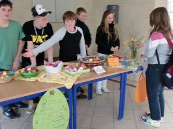 Sage und schreibe 220 kunterbunt gefärbte Ostereier sorgten am Freitag für vorösterliche Stimmung an unserer Schule. Bei Schülern und Lehrer fanden sie reißenden Absatz.