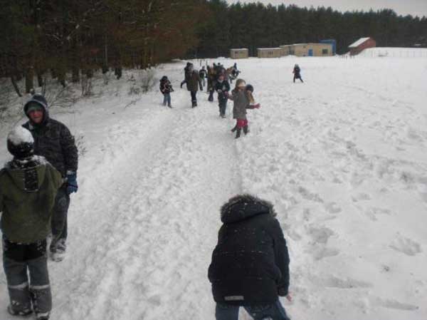 Die Schüler der 5. Klassen tobten sich heute im Schnee aus. Nach der 6. Stunde galt die Hausordnung nicht mehr - Schneeballwerfen war erlaubt! Etwas außerhalb der Stadt gab es genug Möglichkeiten, sich im Schnee auszutoben und der Spaß stand ganz oben - besonders mal den Klassenlehrer zu bewerfen - natürlich aus Versehen.