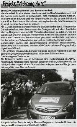 Alle Jahre wieder bekamen wir wieder Besuch vom ADAC. Die Schülerinnen und Schüler der 5a und 5b der Gemeinschaftsschule konnten Marcus Bergmann, Moderator beim ADAC Niedersachsen/Sachsen-Anhalt, begrüßen. Anschaulich erklärte er den Schülerinnen und Schülern in Theorie und Praxis, wie sich der Anhalteweg aus Reaktionszeit und Bremsweg zusammensetzt. Dank an Herrn Bergmann und den Bewohnern der Diesterwegsiedlung, die uns wieder „ertragen mussten“.